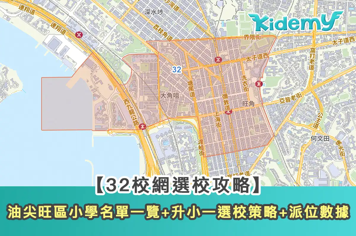32校網地段包括旺角、大角咀、維港灣、頌賢花園、港灣豪庭、凱帆軒、西九龍紀律部隊宿舍、君滙港、大同新邨、富多來新邨、浪澄 灣、一號銀海、海桃灣。
