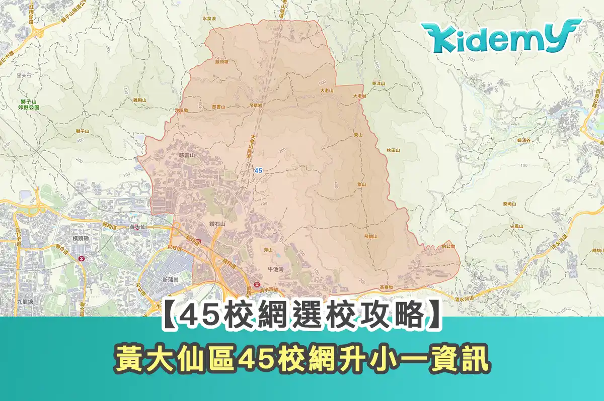 45校網地段包括慈雲山、鑽石山、富山邨、彩虹邨、采頤花園、彩雲邨、彩輝邨、瓊山苑、瓊麗苑、新麗花園、帝峯豪苑、宏景花園、星河明居、龍蟠苑、鳳德邨、鳳凰新村、慈樂邨、慈民邨、慈正邨、彩峰苑、悅庭軒、嘉峰臺、曉暉花園。