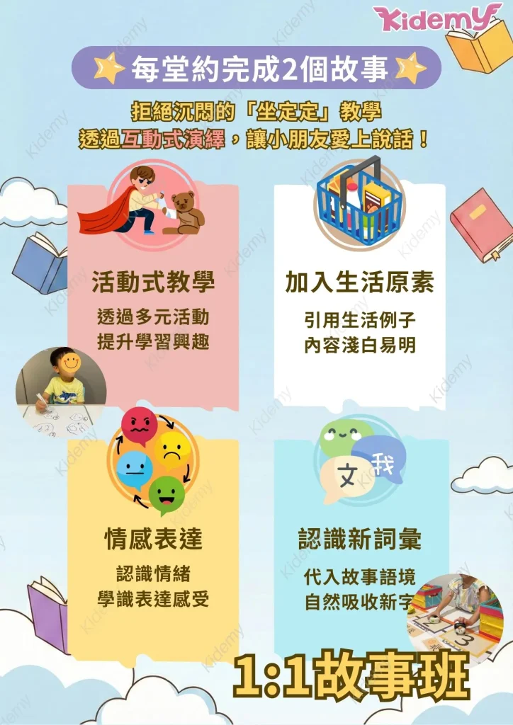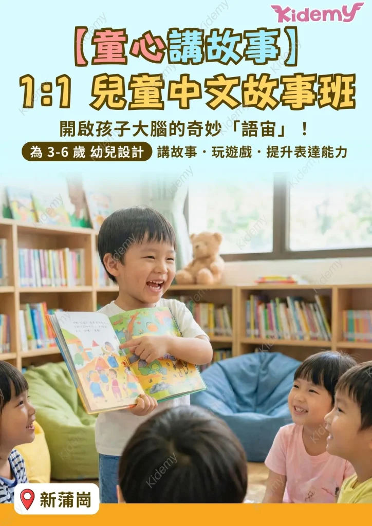 新蒲崗呢個中文故事班專為 3–6 歲幼兒 而設,採用 1 對 1 個別教學,老師可以完全因應小朋友程度調整進度,以輕鬆有趣方式同時培養中文能力同社交表達。課堂以 圖像故事教學為主,每堂會學習兩個主題故事,配合互動小遊戲同角色扮演練習,幫助小朋友喺玩樂中自然學詞語、句式,同時建立開口講中文嘅自信。
