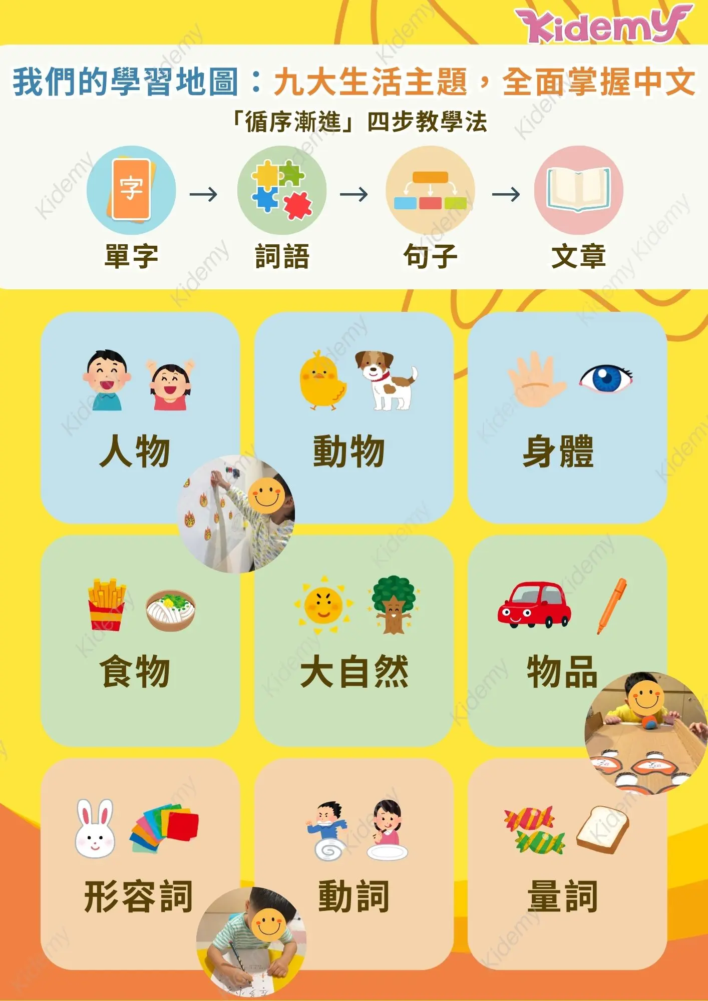 • 生活化主題教學(人物、動物、身體、食物等),提升理解及應用能力